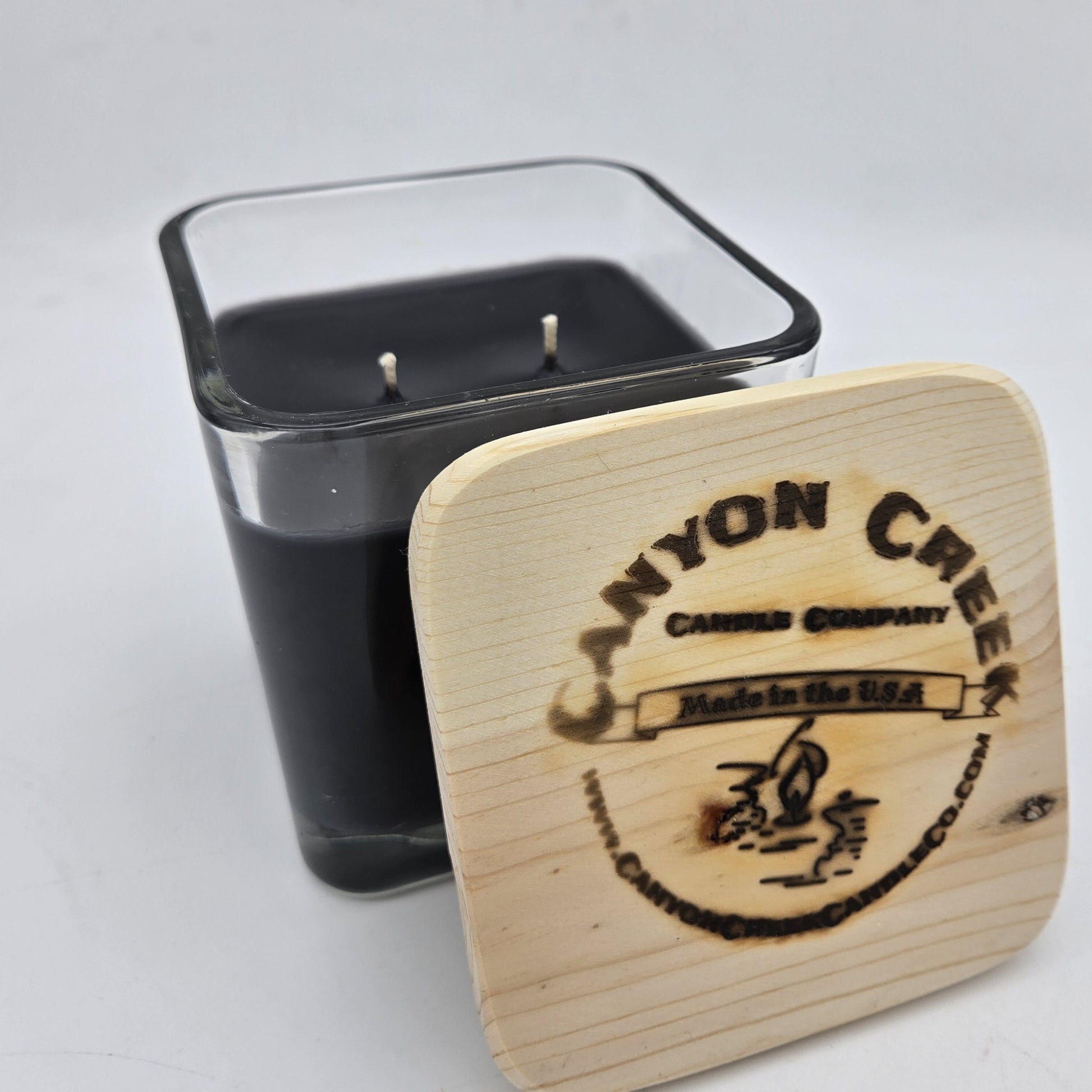 Two wicks for even burning. Cube jar is 4" square at the top and 4" high.