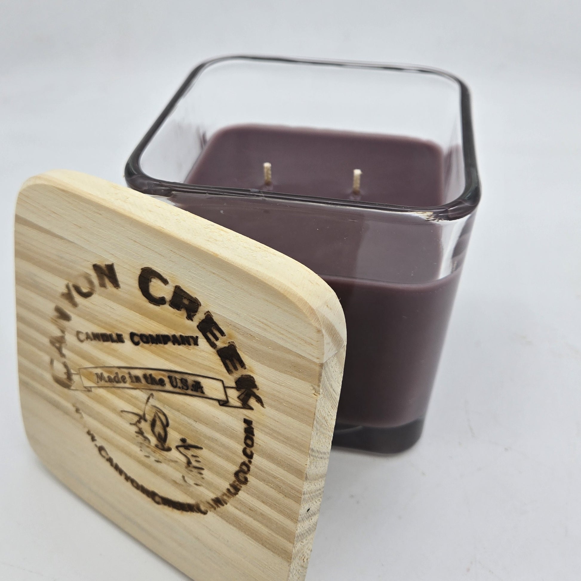 Two wicks for even burning. Cube jar is 4" square at the top and 4" high.